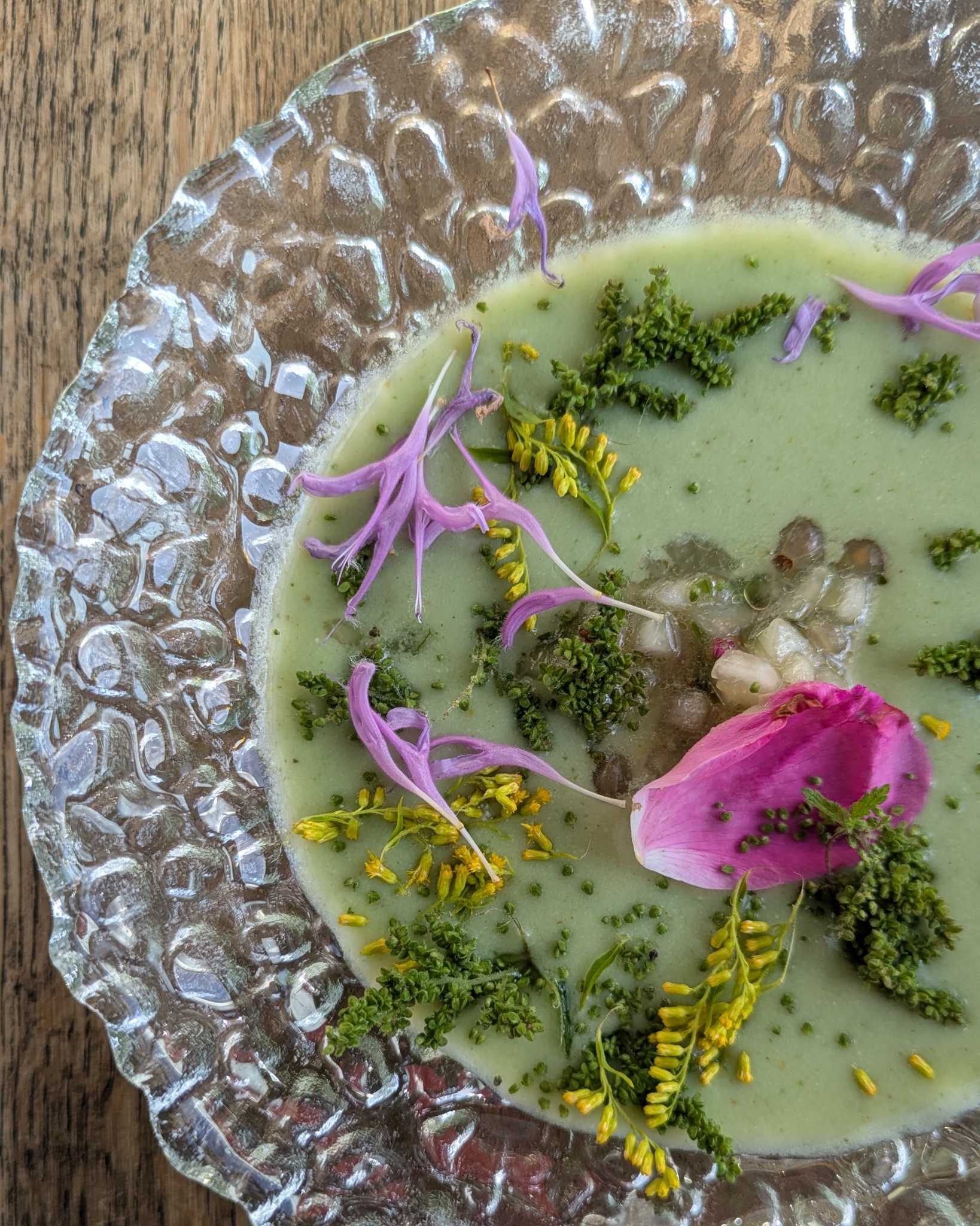 - kurgi ja rohelise tomati gazpacho mulluse lilleäädika teravusega, kaetud valge sõstra-, nektariini- ja tšillisalsaga ning loomulikult rohkete lilledega – mina tutvusin sel aastal esmakordselt sellise külma Pürenee poolsaarelt pärit supiga ja see oli menüüs ka meie enda Avatud talude päeval, siis oli tegemist klassikalise retseptiga, Maru võttis hoopis mängu enda isa ülekasvanud kurgid ja rohelist sorti tomatid – kooslus oli imeline! Ma olen nüüd tõeline gazpacho fänn!