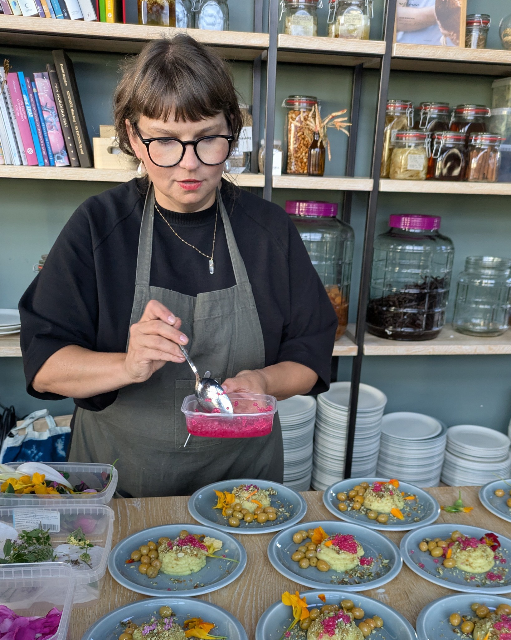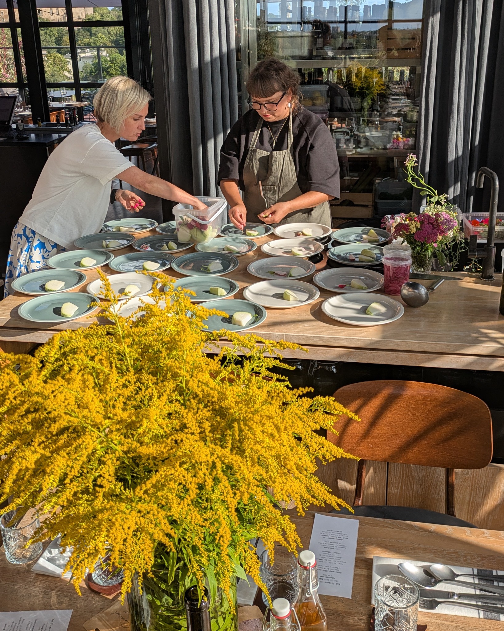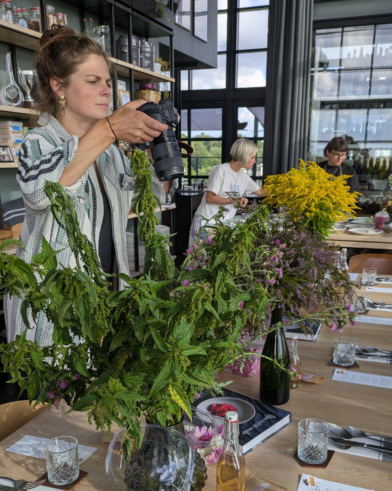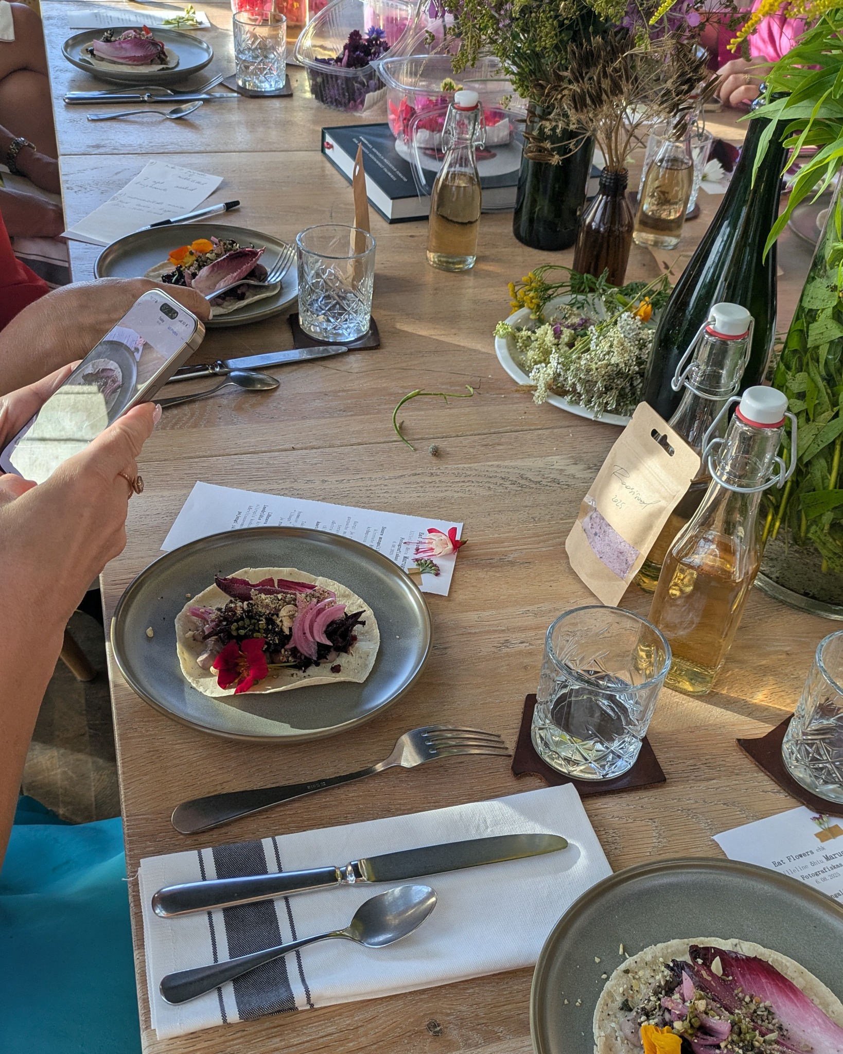 Kõige erilisem selles õhtus oli see, et Maru rääkis lugusid toidust ja õitest ning inimesed said ise kõiki roogasid kaunistada, sest laudadel olid tuhanded (!) õied. 🌺 Mitmed vaasid olid pungil koduaia ja looduse lillekesi, lisaks karpide viisi erinevaid õisi otse taldrikutele: rukki-, saia-, peiu-, mungalill, begoonia, monarda, liilia, aga ka nõges, ohakas, invasiivne ilutaim Kanada kuldvits, raudrohi, kibuvits, angervaks ja palju-palju muud. Elamusi tekitasid rukola ja sibula õied, üllatust pakkus aga floksi ehk aed-leeklille söödavus. Mina hoolitsesin värskete õite eest, Maru tegi süüa ning koos Hanna-Gretaga aitasime õhtu jooksul teda igati. Fotografiska poolt aitas meid veel üks neiu ja muidugi tõeline pildivõlur Kaisa-Maarja, kes juhuslikult võttis kaamera kaasa, aga ei saanud seda praktiliselt terve õhtu maha panna, sest tedagi inspireeris see maagiline üritus looma ilu. Aitäh võrratute jäädvustuste eest, Kaisa-Maarja!