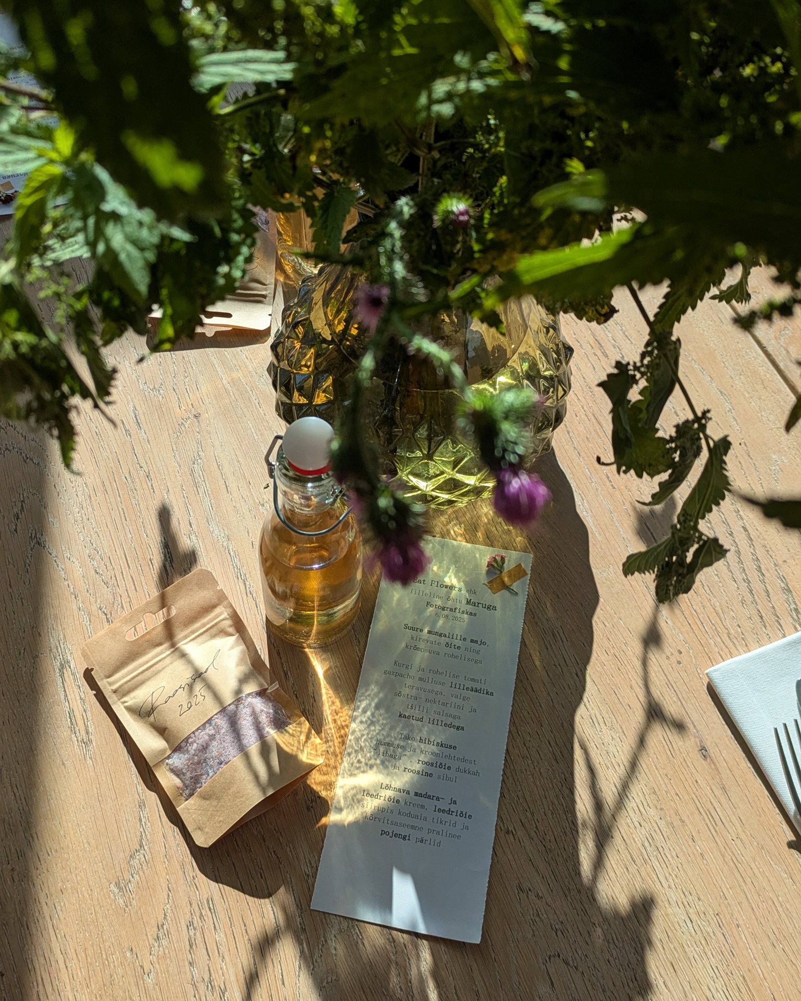 Söömise vahepeal sai igaüks teha endale ka õielise äädika – panna purki valitud õisi ja valada peale äädikat, et kunagi hiljem kodus valmistada näiteks toda sama gazpachot või segada kokku oma salatikaste. Õhtu lõpetuseks viisime inimesed veel väikesele tuurile Fotografiska katuseaeda, kus jagasin sealset kontseptsiooni ja erilisi maitseid. Kõige suuremad hitid olid sidrunaloisia, koolamaitseline ja